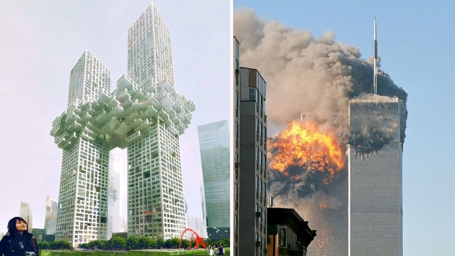 世界貿易センタービルが爆発炎上して噴き出した煙に見えるとの意見が出たのだ。