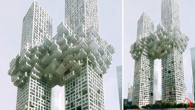 高さ260メートルと300メートルの2棟から成り、中央部分がつながる構造。